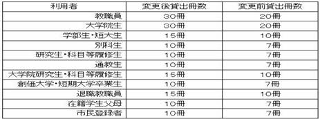 サービス改善及び新規サービスについて 今年も夏休期間に、図書館スタッフ全員が各グループに別れ、図書館サービスの改善の可能性がある約30項目について、熱い議論を交わしました。その内まず優先的な下記6項目について改善し、この10月よりスタートさせました。 (1) 貸出冊数が増加しました 下記表の通り、全ての利用対象者の冊数を平均1.5倍増加させました。今回増加に踏み切った理由は、一つとして論文やレポート作成に当たっては現状の制限冊数では間に合わないことがあること、もう一つは全学読書運動を5年間にわたって展開してきたことにより読書する学生が増えてきており、そのため多巻ものの全集等を借りやすくするためです。なお、今回の冊数増加により、これまで実施していた「長期休業期間(夏休・春休)倍加貸出」と「卒論・修論倍加貸出」(11月-12月)につきましては、今後実施しないことになりました。