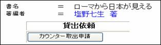 (2) CDの貸出手続きが簡素化されました これまでCD本当とケースを切り離した形でサービスをしておりましたが、この度、CD本体とケースを合体させてCDコーナーに配架しました。このことにより、これまで書庫利用カウンターで手続きをとった後、メインカウンターに移動し貸し出す方式を取っていましたが、この度、メインカウンターで直接手続きが取れる方式に変更しました。 (3) 見学者の見学申請手続きがわかりやすくなりました 図書館正面入退館システムの手前に「見学者券」と案内板を設置し、見学者が申請手続きをとる方法がわかりやすくなりました。 (4) 池田文庫の長期保存対策として、専用袋に入れて館外貸出を行うことになりました。また劣化が著しい図書は修復処置等を行い、本学の財産として永く留める対策をとってまいります。 (5) グループ学習室の機能向上化を図りました 「グループ学習室」で、最近要望が多く寄せられていたプレゼンテーション準備のためのプロジェクターの利用開放を始めました。また、利用申請の簡略化を以下のようにはかりました。 ①1Fインフォメーションカウンターに「グループ学習室利用許可証・点検表」と学生証をご提出ください。この際、申請者本人に長期延滞中の未返却図書(8日以上)がある場合は、グループ学習室の利用ができませんので、くれぐれも注意をしてください。 ②グループ学習室の鍵をお渡しします(紛失しないよう十分注意をしてください)。終了時に返却してください。学生証は終了時までお預かりします。 ③利用終了後は、部屋をキレイに整頓した後、所定の「点検表」に必要事項を記入し、鍵をサービスカウンターに返却してください。学生証をお返しします。 (6) 当日返却図書の利用がスムーズに行えるようになりました 当日返却された図書(検索詳細画面で配置場所が「カウンター」と表示されるもの)について、検索画面から図書情報をレシート出力できるようになったため、利用者からの要望があった際、図書の取出しをスムーズに行えるようになりました。 例えば、以下の図書は、本日返却された図書ですが、検索結果詳細画面を見ると、本の所在場所は「1Fカウンター」と表示されています。その本を借りたい場合は、以下の「カウンター取出申請」ボタンをクリックし、ログインすれば、直ちにレシートがカウンターに出力されるため、速やかに借りることができます。これまでは数百冊(試験期などは千冊以上)もの本がカウンター内にあるため探すのが容易ではありませんでしたが、このことにより改善を図ることができました。