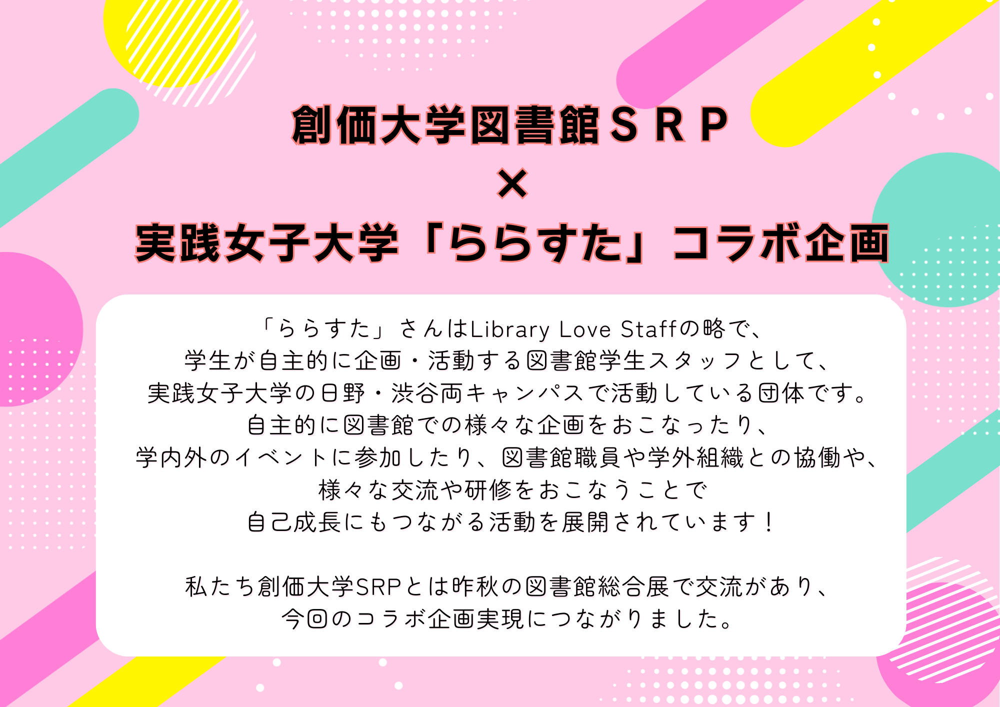 「ららすた」さんは、学生が自主的に企画・活動する図書館学生スタッフとして、実践女子大学の日野・渋谷両キャンパスで活動している団体です。本学SRPとは昨秋の図書館総合展で交流があり、今回のコラボ企画実現につながりました。