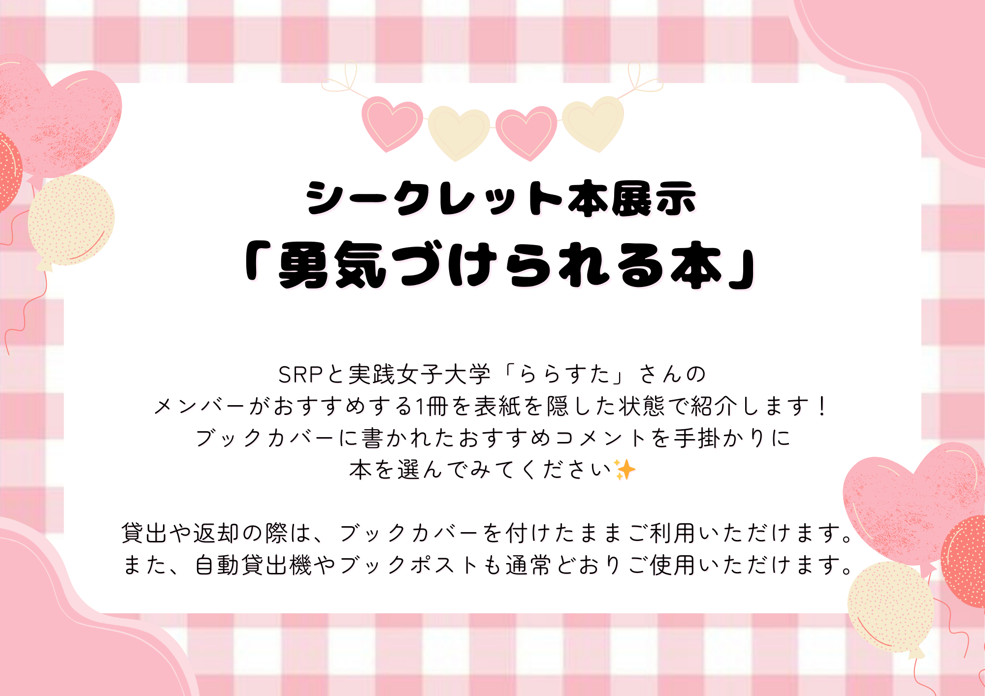 現在、創価大学図書館Soka Reading Project(SRP)×実践女子大学日野キャンパス「ららすた」コラボレーション企画「シークレット本『勇気づけられる本』」を両大学で展示中です。
