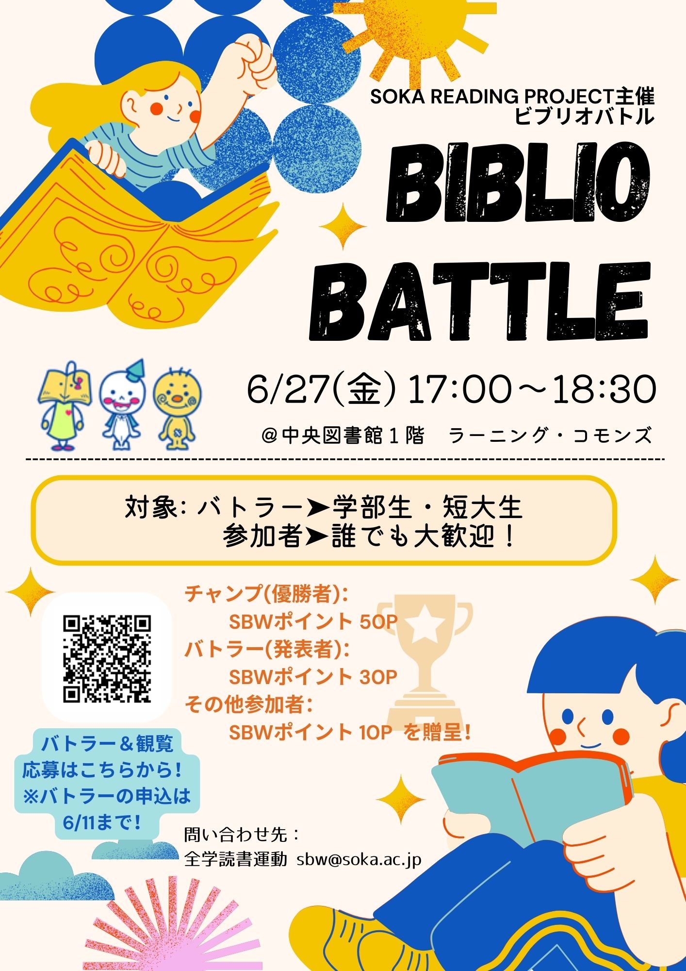 SBWこの度、Soka Reading Project (SRP)は6/27(金)中央図書館にてビブリオバトルイベントを開催します。